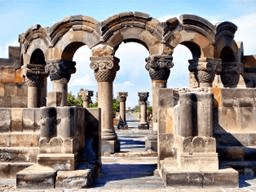 cristianismo en Armenia. Visita a la iglesia de Santa Hripsimé (s.7). Visita a la Catedral principal, la iglesia cristiana más antigua en el país y la residencia oficial del Catóghicos armenio. Luego visita a las ruinas del Templo de Zvartnots (Templo de los Ángeles del cielo, s.7). Regreso a Yereván. Almuerzo en el restaurante. Visita al Museo Nacional de Historia. Visita al mercado de artesanía al aire libre en Yereván- Vernisage. Cena y alojamiento en Yereván.